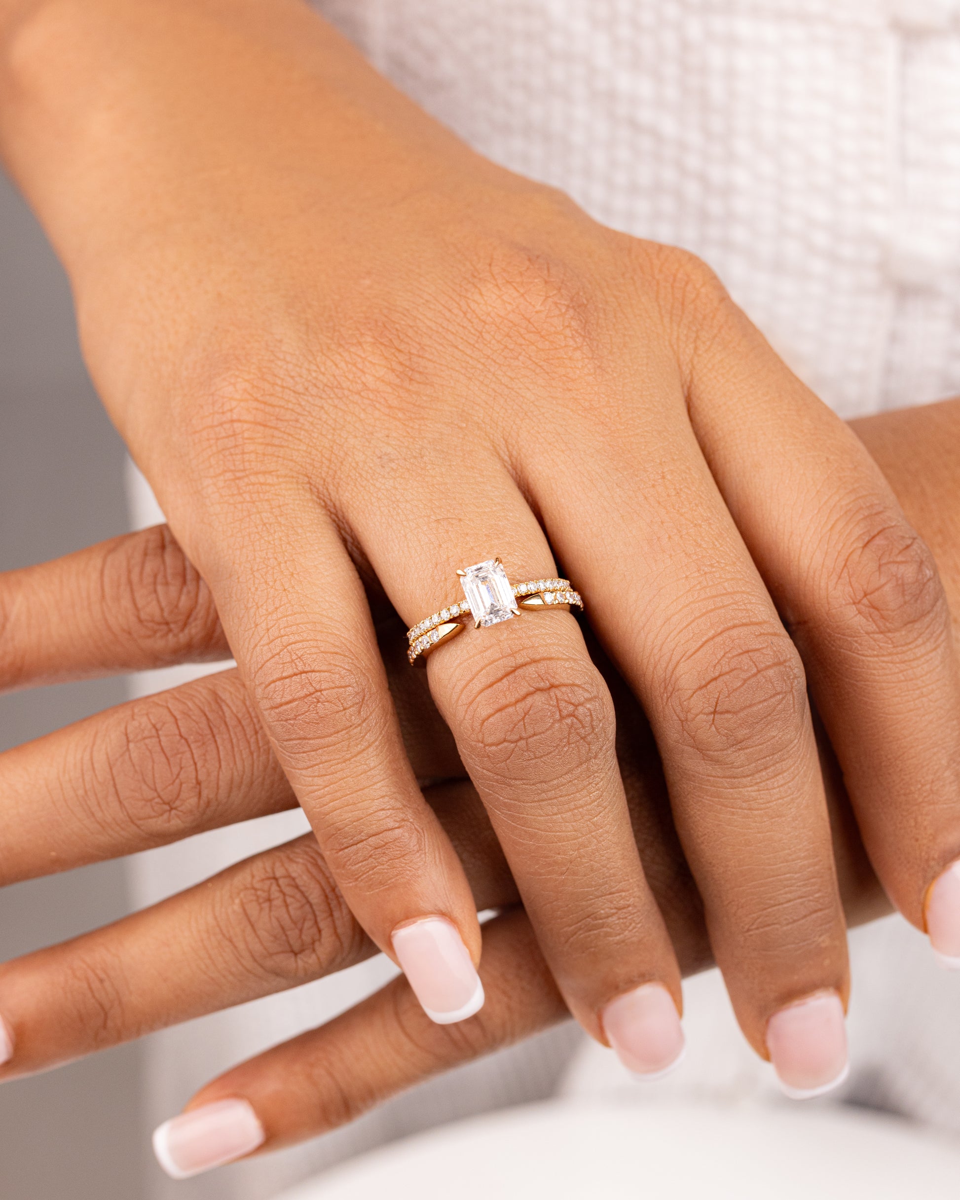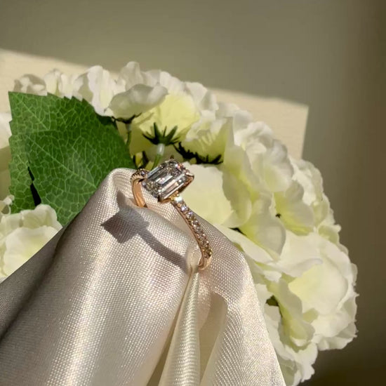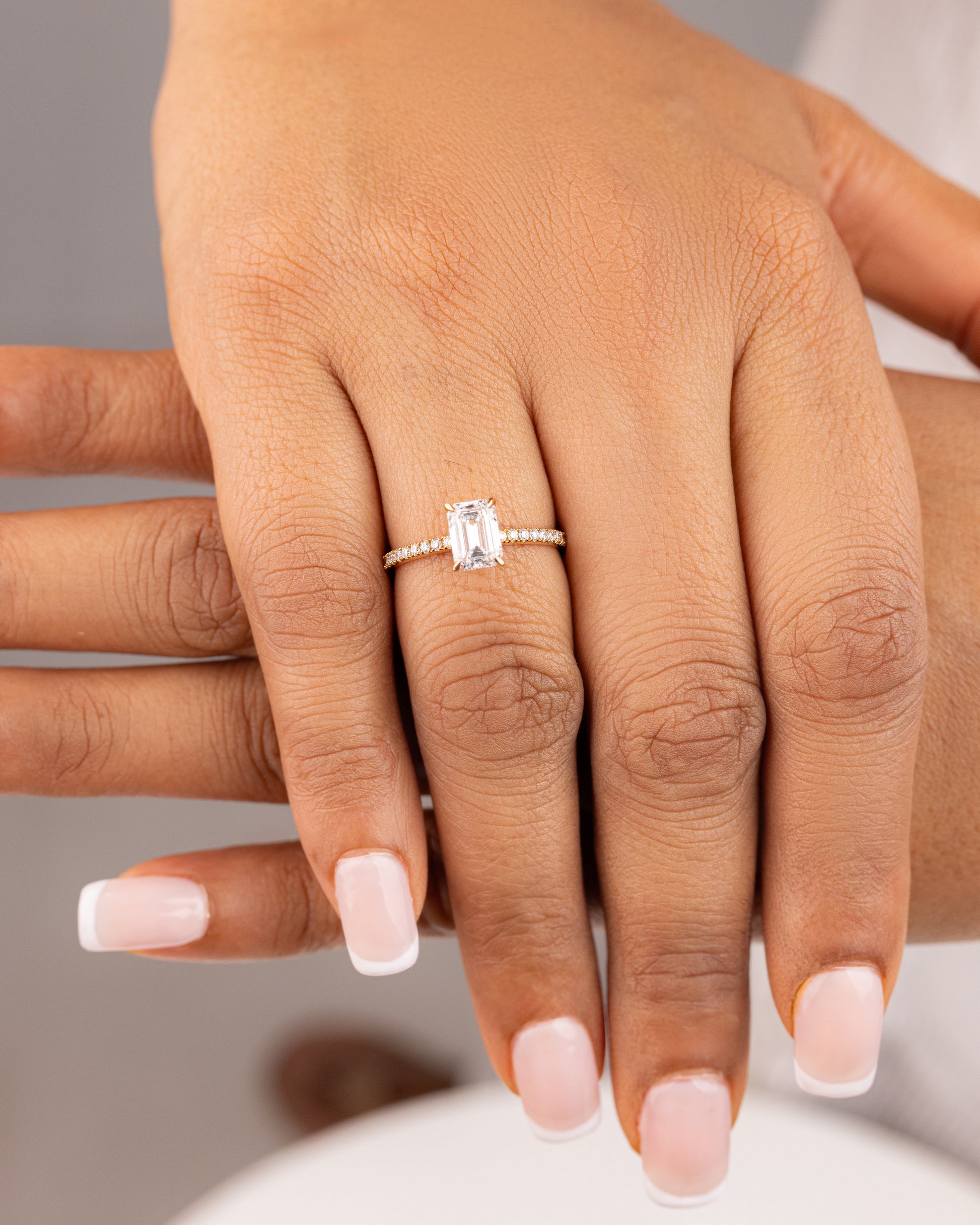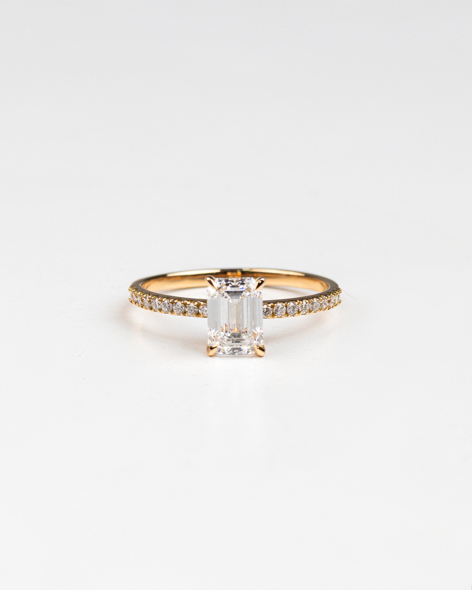 Crafted with precision design in 18 karat fine gold, this ring is a testament to timeless beauty. It features a magnificent 1 carat emerald cut lab-grown diamond with VS1 clarity at its center. This exceptional stone, known for its elegant step-cut facets and captivating "hall of mirrors" effect, stands out with its sophisticated brilliance.