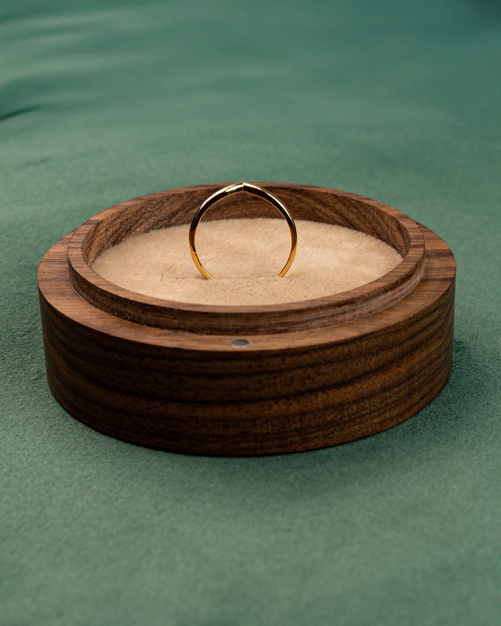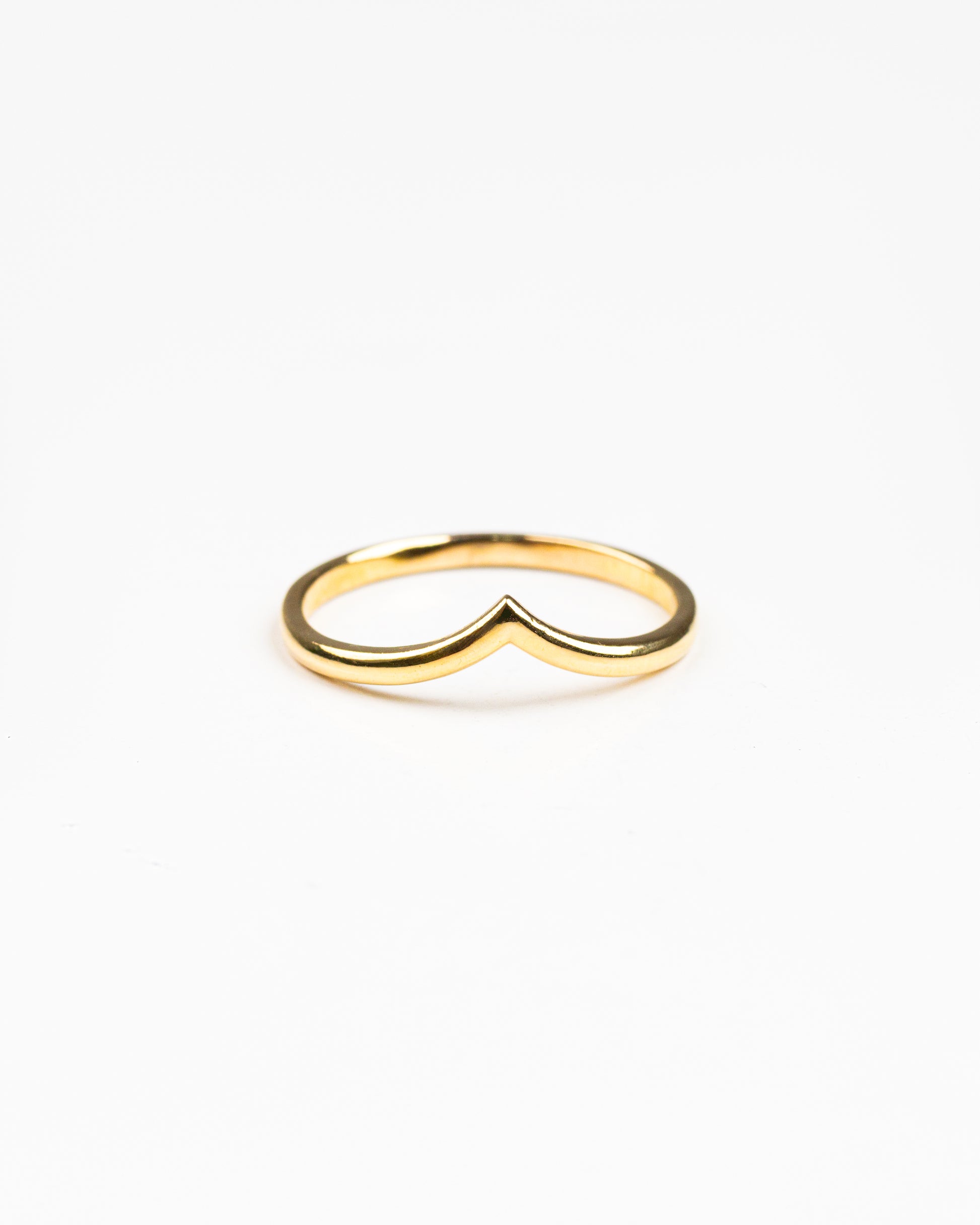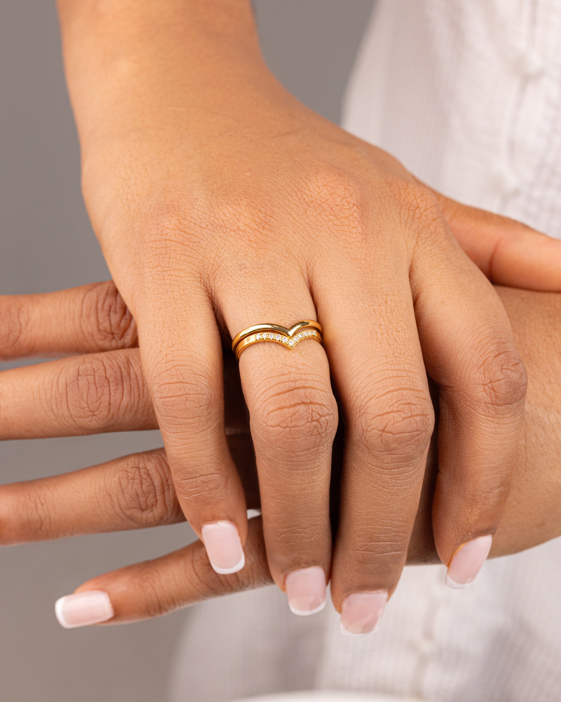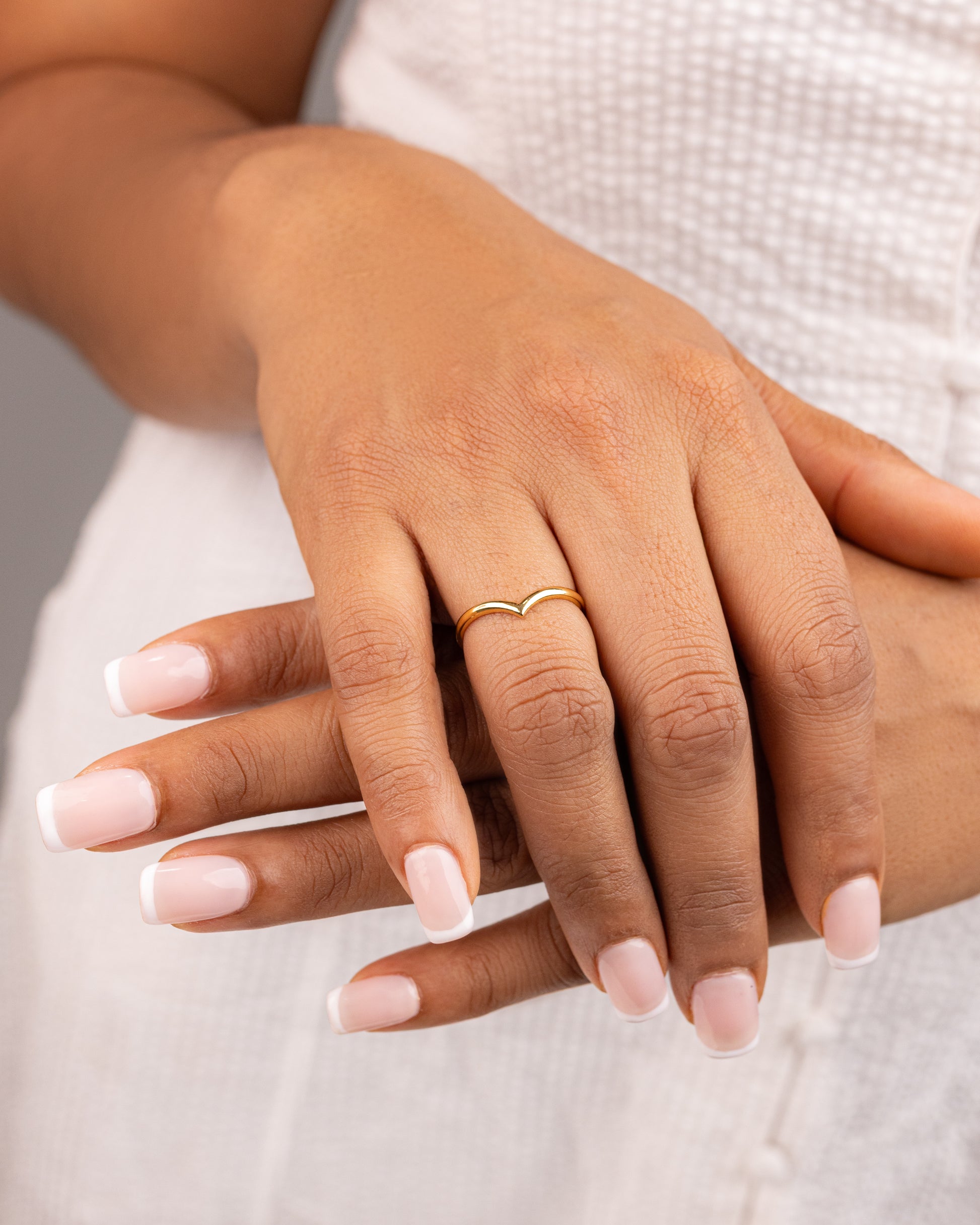 Sculpted in glowing 18 karat yellow gold, this sleek V-shaped ring embodies minimalist elegance. The gentle chevron curve adds subtle character, making it a timeless piece with a modern edge. Its fluid silhouette flatters the hand effortlessly, offering refined beauty without excess.