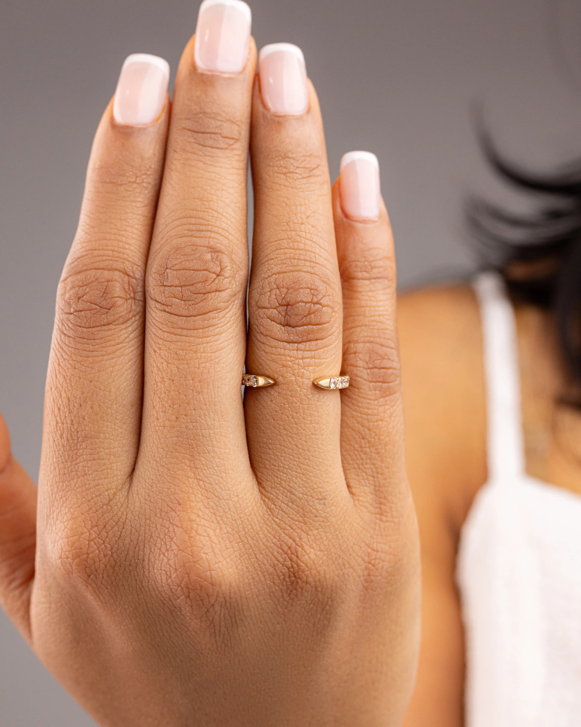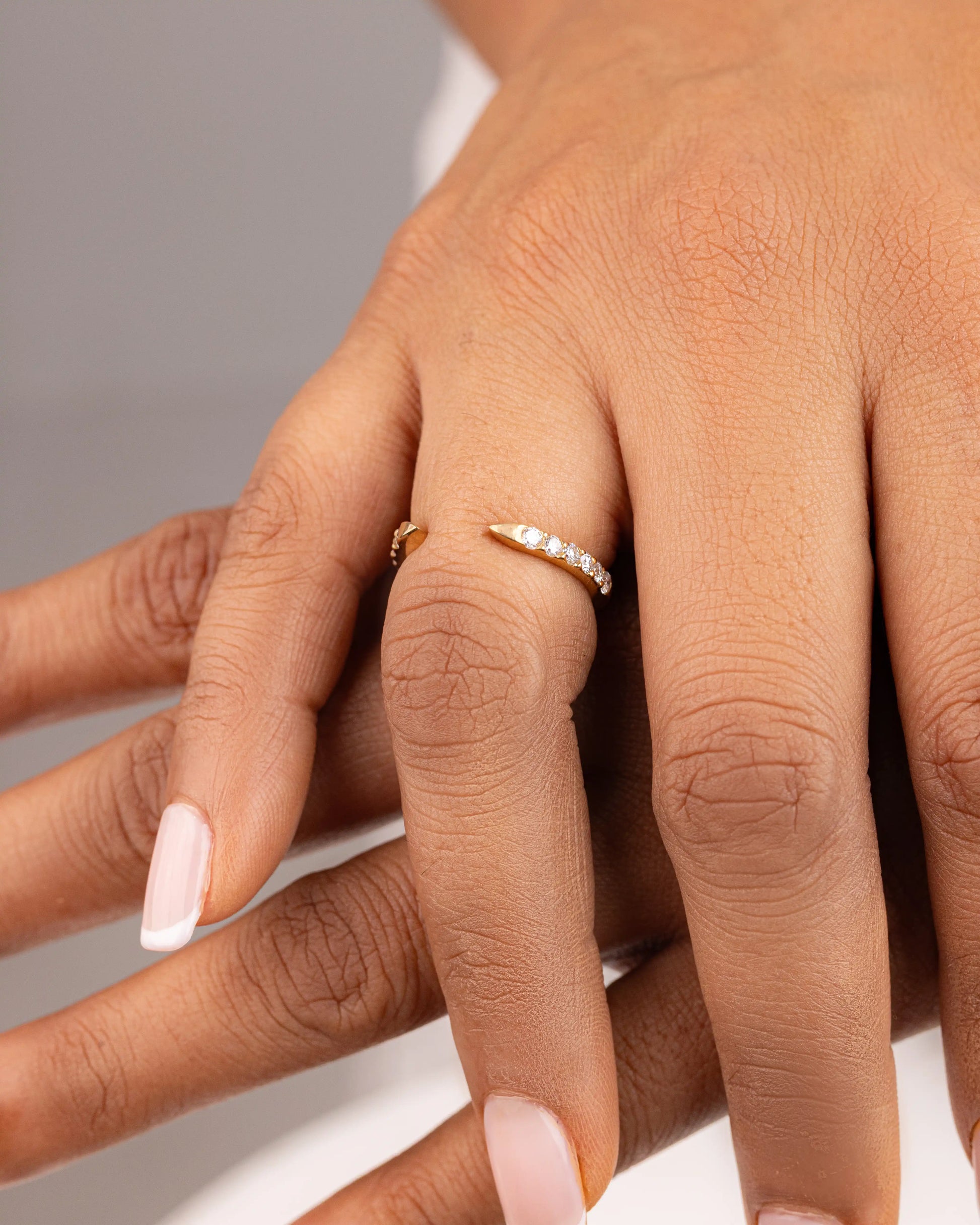 The sleek flat band and open design make this ring a comfortable and unique accessory, perfect for effortless styling. It is ideally suited for life's most valuable celebrations, whether worn as a modern engagement ring, a sophisticated wedding band, or a versatile piece for day-to-day wear.